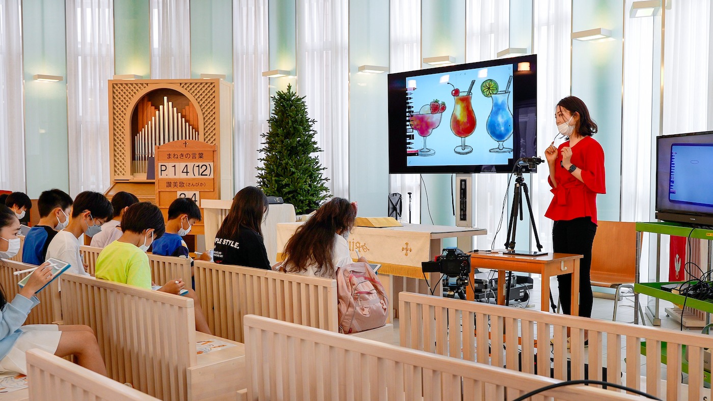 2022年6月22日 同志社小学校にて、4−6年生対象にiPad授業を担任しました。児童が毎日礼拝を行うチャペル会場で開催し、会場には30人名を招待。また他の8クラスに同時配信する形で授業を行いました。無料アプリ「Tayasui Sketch」を使い、夏のジュースをイメージしたイラストの描き方を披露しました。